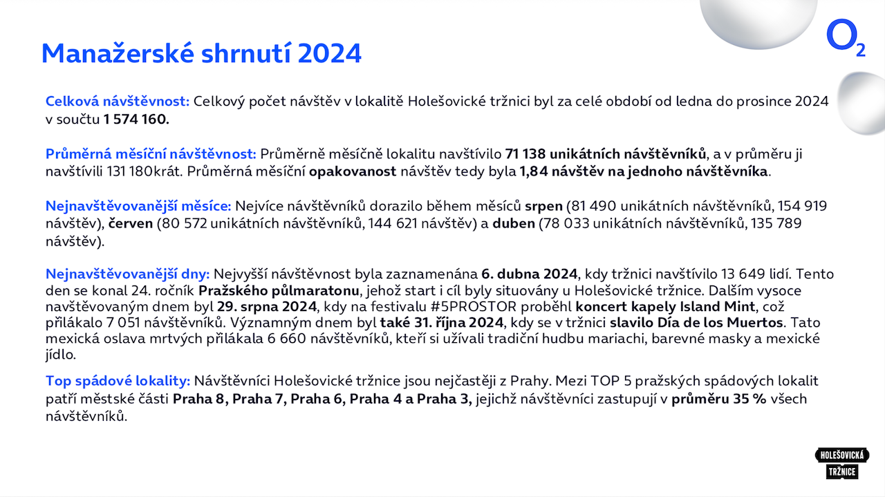 Průměrně tržnici měsíčně navštívilo 125 tisíc unikátních návštěvníků, kteří se do areálu vraceli téměř dvakrát měsíčně. Nejvyšší návštěvnost byla zaznamenána v září, červenci a říjnu, což potvrzuje silnou sezónnost a atraktivitu podzimních a letních akcí v areálu.